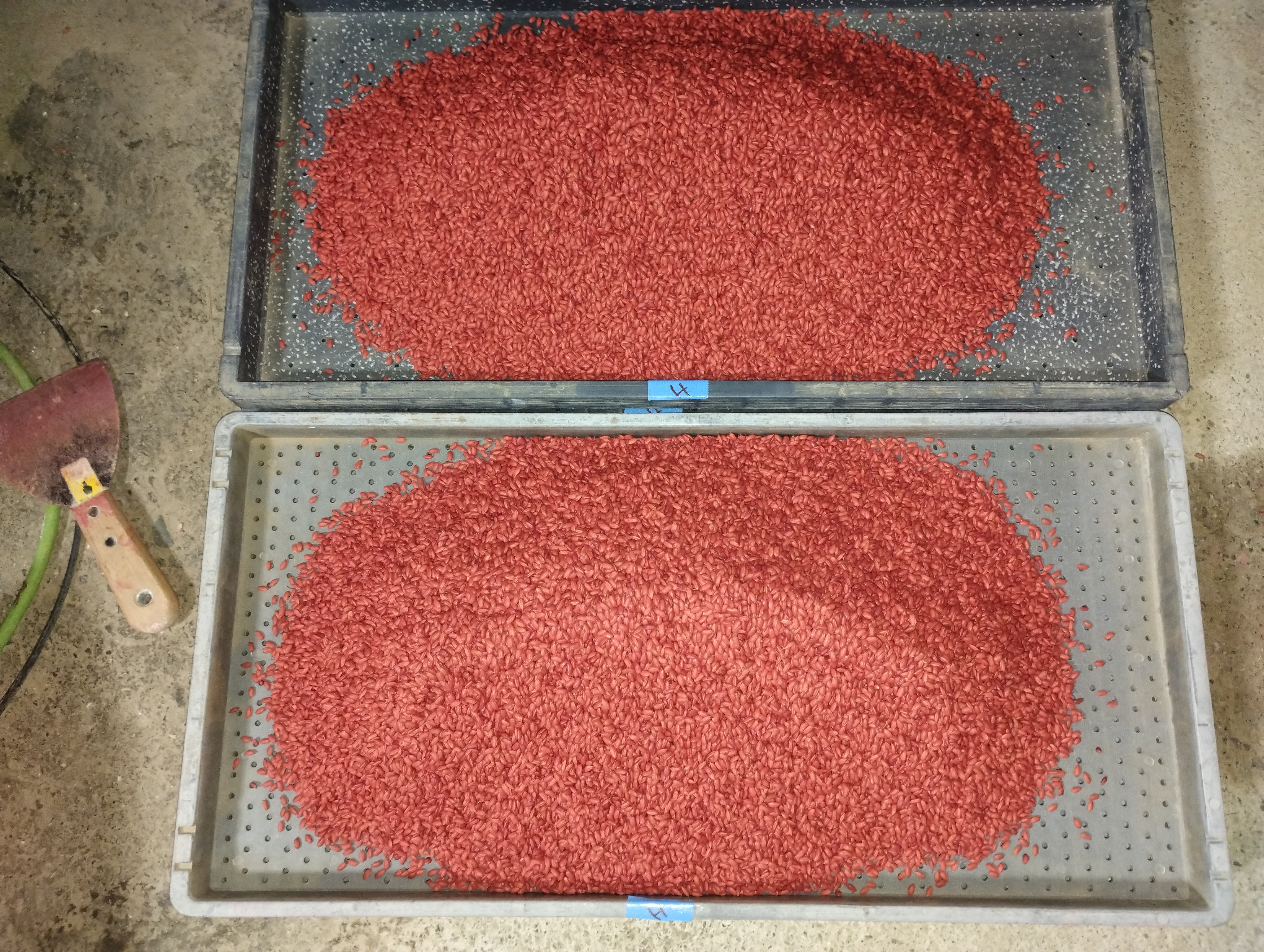 十分に混ざった籾は育苗箱に移し、風通しの良い場所で1〜2日程かけて乾燥させます。